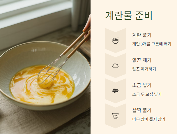 알끈 제거하고 소금 두 꼬집 넣은 뒤 살짝만 풀어주세요. 너무 많이 풀면 질감이 떨어져요. 🥚